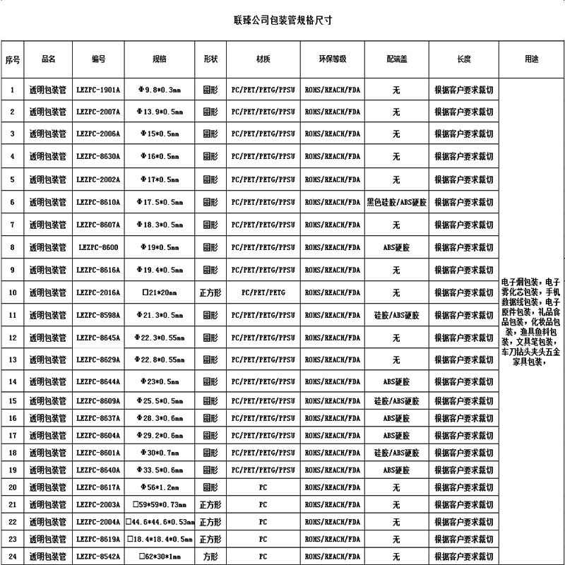 ? 用途:我司環(huán)保食品級(jí)PC管,廣泛應(yīng)用于食品包裝和食品裝飾,可以根據(jù)客戶的要求定制顏色、長(zhǎng)度、外徑、厚度、形狀等來(lái)滿足客戶的不同需求;還可以用在化妝品包裝裝飾、玩具包裝、燈飾照明、建筑行業(yè)、醫(yī)療器械、電子產(chǎn)品等各行各業(yè)中。